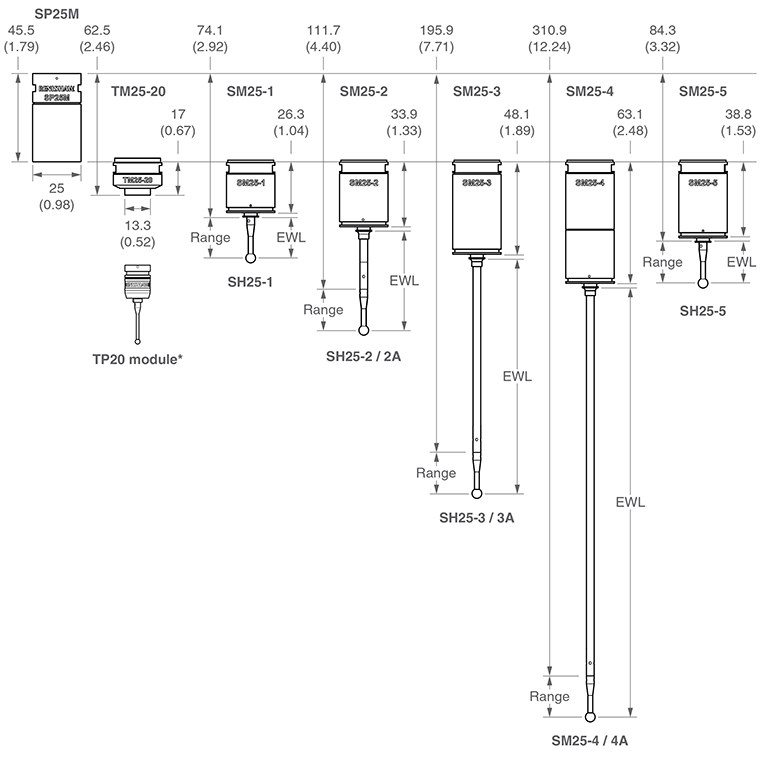 SP25M bao gồm hai cảm biến trong một vỏ duy nhất. Người dùng có thể chuyển đổi giữa năm mô-đun quét (có thể sử dụng đầu dò M3 với chiều dài từ 20 mm đến 400 mm) và một mô-đun bộ chuyển đổi tương thích với dòng mô-đun đầu dò TP20 của Renishaw. Khả năng này cho phép quét và dò kích hoạt bằng cảm ứng trong một hệ thống đầu dò duy nhất.